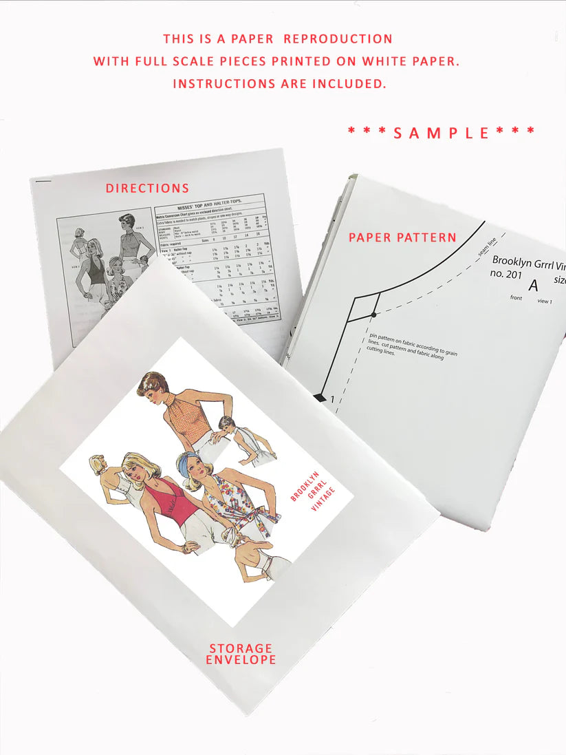 Step back in time with this PAPER reproduction of a classic vintage pattern! Each piece is full-scale and printed on sturdy, crisp 20lb white paper—heavier than delicate tissue, making it easy to trace or pin. Complete instructions are included, so you can bring your retro creation to life with confidence.